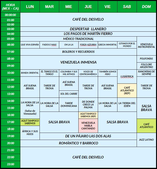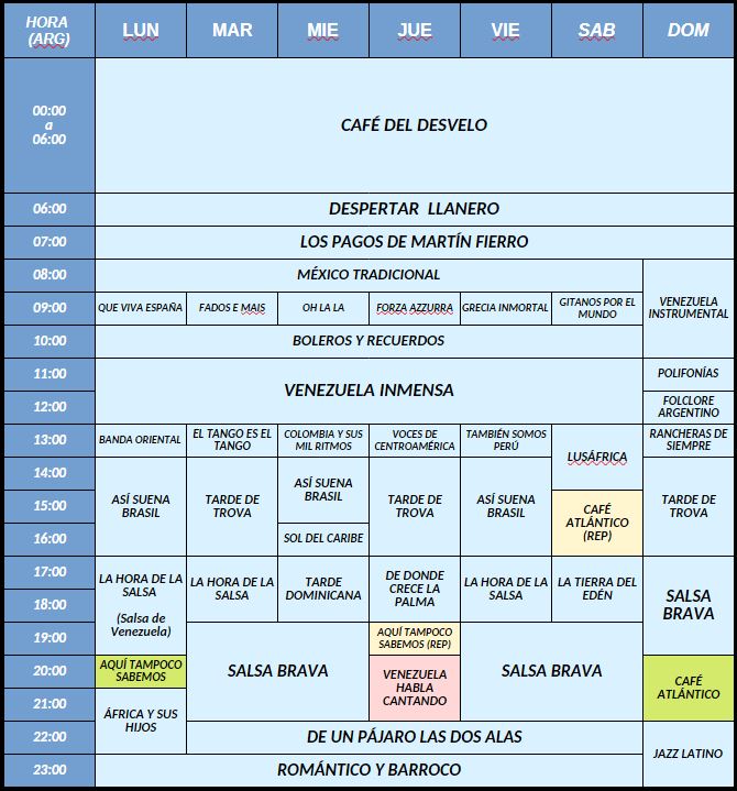 Con la intención de facilitar que puedas escuchar tus programas favoritos, presentamos acá nuestros horarios de transmisión. Lamentablemente algunos países tienen más de un huso horario o cambian de horario según la fecha, en cuyo caso hemos tomado el horario correspondiente al verano en el hemisferio norte.