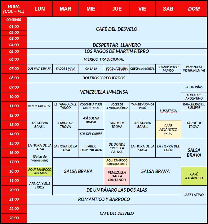 Programación y horarios paraBolivia, Colombia, Ecuador y Perú.