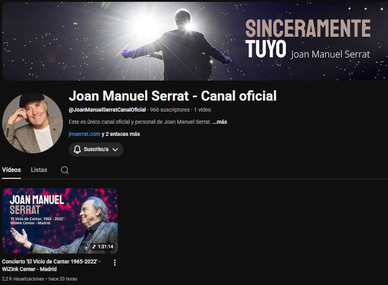 (RCA – 05/03/2026) Mediante un comunicado sencillo y con muy pocas palabras, Joan Manuel Serrat le hizo saber a sus admiradores que desde ahora está disponible su canal en la plataforma Youtube y que lo estrena con el concierto El vicio de cantar 1965-2022 grabado en el WiZink Center de Madrid.
